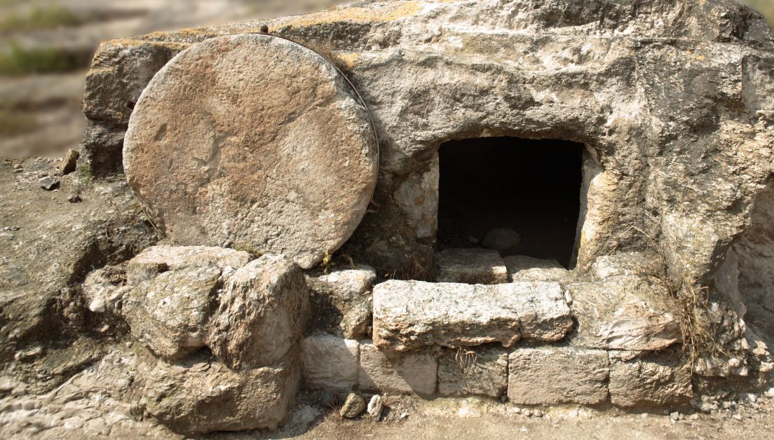 Joseph and Nicodemus wrapped Jesus in the linen cloth and laid him in a typical first-century Jewish tomb, cut into a rock or a cliff. They placed the body on a stone bench inside the burial chamber. Then they rolled a large stone across the entrance to seal the tomb and mark the site.